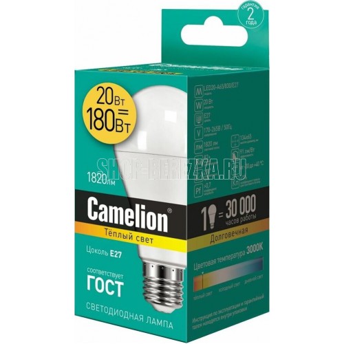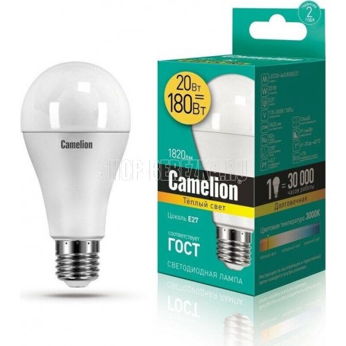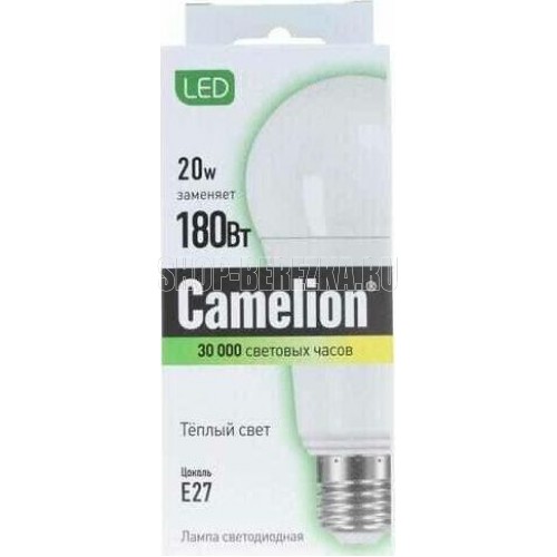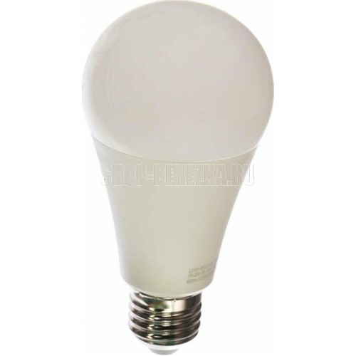 LED лампа, мощность, Вт - 20, напряжение, В - 170-265, световой поток, лм - 1820, форма колбы - груша, цвет колбы - белый, цоколь E27, цветовая температура, К - 3000, угол светового пучка - 270, индекс цветопередачи 80+, срок службы, ч. - 30000