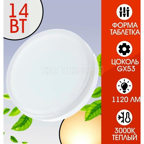 Лампа светодиодная, выполнены в форме цилиндра с цоколем GX53, мощность - 14Вт, аналог лампы накаливания - 120, цветовая температура, К - 3000, напряжение, В - 220-240 В, отсутствие мерцания, бесшумная работа.