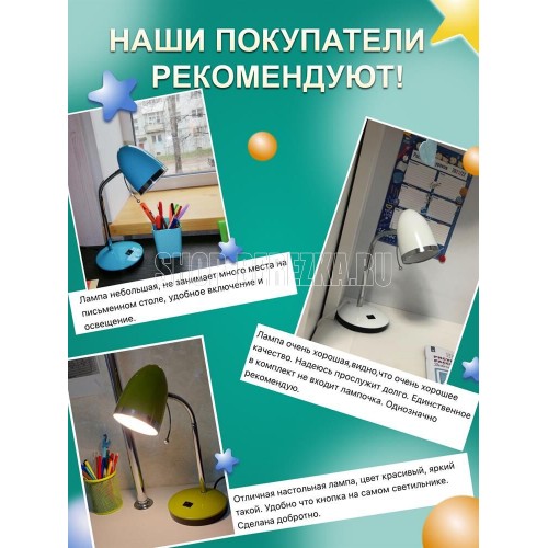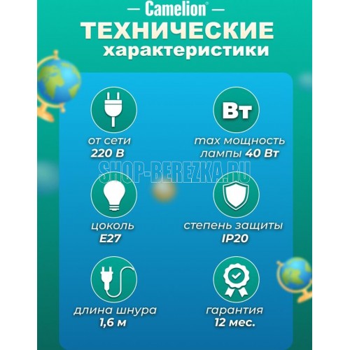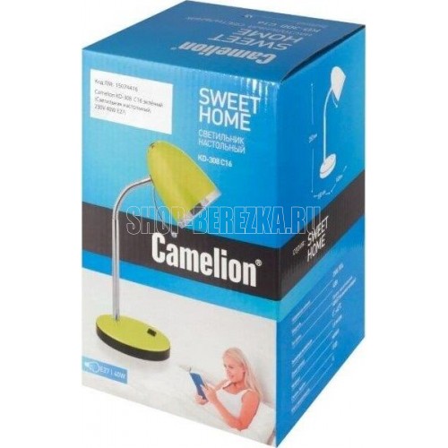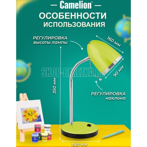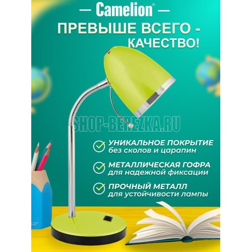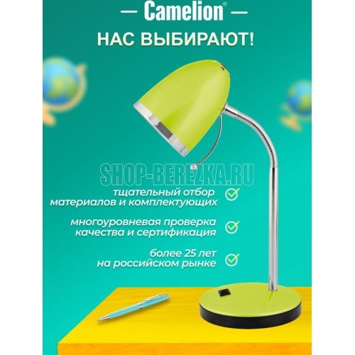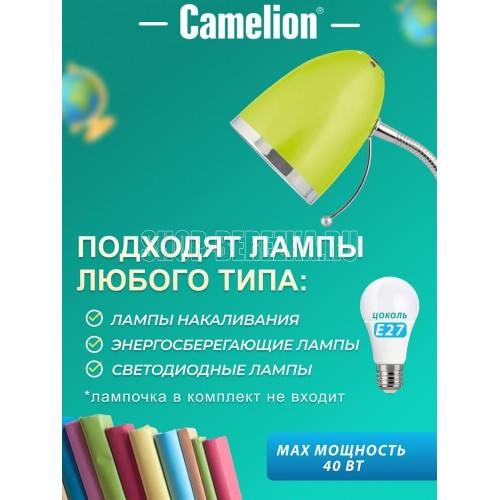 Настольный светильник Camelion KD-308 C16 зеленый, размер 150х150х240мм, источник света - ЛОН, тип лампы - 40/A/Е27, патрон - E27, мощность 40Вт, ~230 В, 50 Гц.
