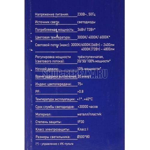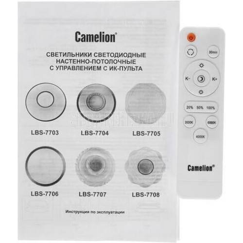 Настенно-потолочный LED светильник управляемый с пультом Camelion LBS-7704, диаметр 500мм, мощность 72Вт, аналог лампы накаливания - 380, световой поток - 4800лм, цветовая температура 3000-6000К, питание 230В / 50Гц
