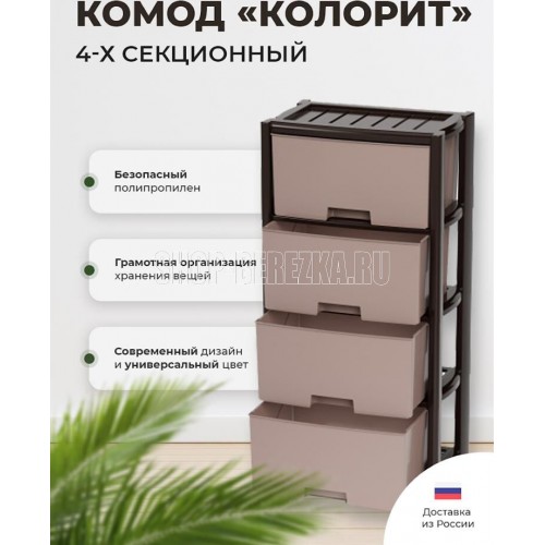 Вес 4.019 кг Размеры изделия (ДхШхВ) 475х300х940 мм Объём упаковки 0.14 м3 Размеры упаковки (ДхШхВ) 490х300х950 мм Комод произведен из высококачественного и безопасного полипропилена. Особую прочность комоду придает его цельная конструкция перегородок. Комод имеет выдвижные и достаточно вместимые ящики. На крышке и перегородках предусмотрены ограничители, благодаря которым ящик не будет вылетать при открывании. Такой комод станет отличным решением для организации хранения практически в любой комнате вашей квартиры или дома. Благодаря цветовому решению и современному дизайну, комод гармонично впишется в интерьер любой комнаты. Благодаря небольшому весу и компактному размеру, комод легко устанавливается и передвигается. Комод упаковывается в индивидуальную упаковку и будет поставляться уже в собранном виде.