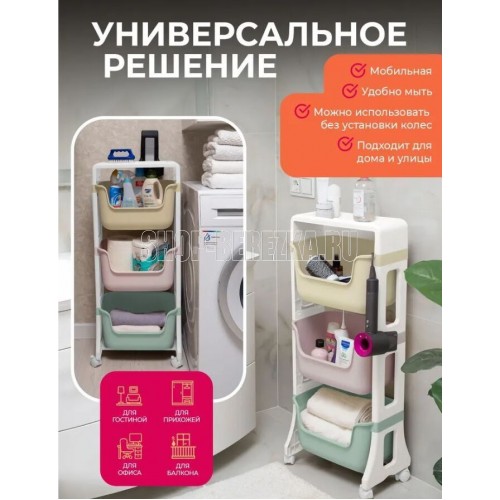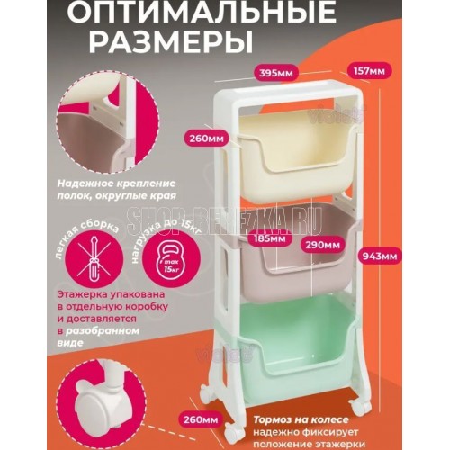 Этажерка Junior напольная 3-х ярусная на колесах VIOLET, цвет микс. Размеры изделия: 39,5х26х95 см. Все детали этажерок сконструированы таким образом, что при соединении их создаётся надёжная фиксация.Никаких острых краёв и углов у этажерок нет, мягкие округлые формы, устойчивость и безопасность использования.Все этажерки идут с вращающимися колёсиками, что очень удобно в использовании в любом уголке вашего дома(можно ставить как с ними, так и без них). Колёсики оснащены стопорами, при нажатии которых этажерка не сдвинется с места. Легкость перемещения делает этажерку незаменимым помощником в быту для организации хранения и порядка вещей различного назначения.