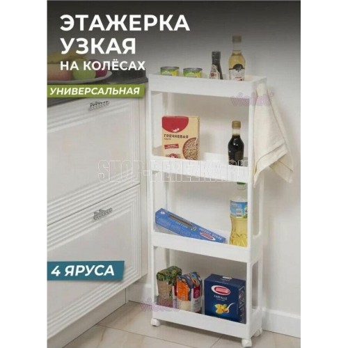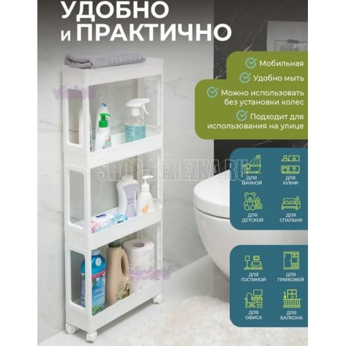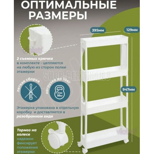 В комплекте к этажерке из двух ярусов идет 1 съемный крючок, к этажерке из трех и четырех ярусов 2 съемных крючка. Их можно установить на любую сторону полки для хранения. Пластиковые колесики (поставляются в модели из трех и четырех ярусов) делают этажерку мобильной и удобной в использовании. Тормоз на колесе надежно фиксирует положение. При этом колесики можно снять и использовать без них. Каркас этажерки выполнен из прочного пластика и не прихотлив в уходе, достаточно протереть влажной губкой или промыть под струей теплой воды. Изделие безопасно, не имеет острых углов и изготовлено из экологичного материала, не содержащего бисфенол А и предназначенного для контакта с пищевыми продуктами. Этажерка поставляется в разобранном виде в индивидуальной упаковке и собирается за пару минут. Размер этажерки из двух ярусов в собранном виде - 340х395х129мм. Размер этажерки из трех ярусов в собранном виде - 664х395х129мм. Размер этажерки из четырех ярусов в собранном виде - 947х395х129мм.