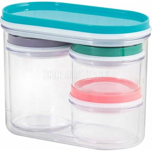 Универсальный набор банок для хранения 4 баночки для хранения, размеры: 1шт.: 15*7*10см 1шт.: диаметр: 6.5см, высота: 7см 2шт.: диаметр: 6.5см, высота: 3см материал: полипропилен, полиэтилен, полистирол упаковка: термоусадка Экономия места – модульная конструкция. Продукты дольше сохраняют свежесть – герметичная крышка. Хорошо видно содержимое и его объем – прозрачный корпус.