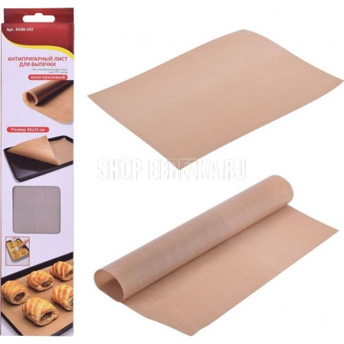 Для аккуратного и более эффективного запекания в духовке используйте антипригарный лист для выпечки. С этим приспособлением вы исключите прилипание к противню и сможете готовить пищу без масла. Лист используется для приготовления пищи в посуде, как в духовках, так и на варочной панели. Кроме того, само тесто можно раскатывать по поверхности изделия. Приспособление также можно использовать для заморозки в морозильной камере, например, для заготовок пластов теста. Лист предназначен для многоразового использования, легко моется обычной губкой со средством, не впитывает запахи. Изделие изготовлено из тефлона, армированного стекловолокном. Такой материал выдерживает температуру до 260 С, обладает отличными антипригарными свойствами. Стекловолокно придает прочность, при этом не влияет на гибкость. Состав: тефлон армированный стекловолокном. Имитирует плотную бумагу. ВНИМАНИЕ: Не режьте выпечку ножом на листе. Не используйте абразивные материалы и жесткие щетки, повреждение тефлонового слоя