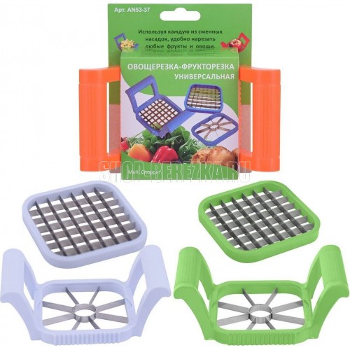 Для быстрой и удобной нарезки овощей используйте универсальную овощерезку-фрукторезку. Изделие подходит для нарезки сырых и вареных овощей ломтиками или кубиками в салат. Режьте с помощью сменных насадок картофель, свеклу, яблоки, морковь, яблоки, свеклу и другие продукты. Расположите продукты на столе и аккуратно надавите рабочей частью овощерезки. Держите инструмент за ручки и регулируйте уровень нажима, чтобы получить аккуратные кубики. Корпус изготовлен из пластмассы (ABS), рабочая часть — из коррозионностойкой стали. После использования промыть с моющими средствами и тщательно высушить.