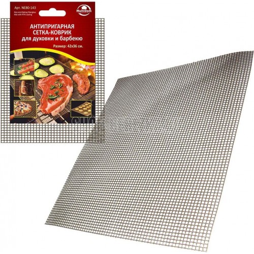 Антипригарная сетка - настоящая находка для хозяйки. Это приспособление защитит поверхность решётки для барбекю или противня от пригорания, позволит приготовить здоровую пищу без использования масла или жира. Сетка способствует циркуляции воздуха, что позволяет добиться хрустящей корочки во время запекания или жарки. Приготовленные блюда не пригорают и легко снимаются с сетки. Жаростойкость - до 260 °С. Сетка рассчитана на многоразовое использование, практична и проста в уходе. Перед первым применением и после каждого использования рекомендуется вымыть губкой или мягкой щёткой, можно с жидким моющим средством, сполоснуть проточной водой и просушить. Можно мыть в посудомоечной машине. ВНИМАНИЕ Не режьте приготовленные блюда ножом на сетке. Не используйте абразивные материалы и жёсткие щётки. Изготовлено из тефлона, армированного стекловолокном. Размер 42х36 см.