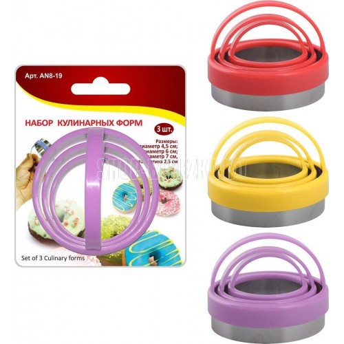 Существует множество приспособлений для домашней выпечки и работы с тестом. Для того, чтобы вырезать кружочки из теста для приготовления печенья, домашних вареников, пончиков и других изделий, используйте набор кулинарных форм с разными диаметрами. Изделия выполнены в виде круга с пластмассовой окантовкой и ручкой. Металлический край формы достаточно острый, чтобы вырезать кружок из теста, при этом он абсолютно безопасен. Кулинарная форма изготовлена из коррозионностойкой стали, окантовка и ручка из пластмассы (полипропилен).