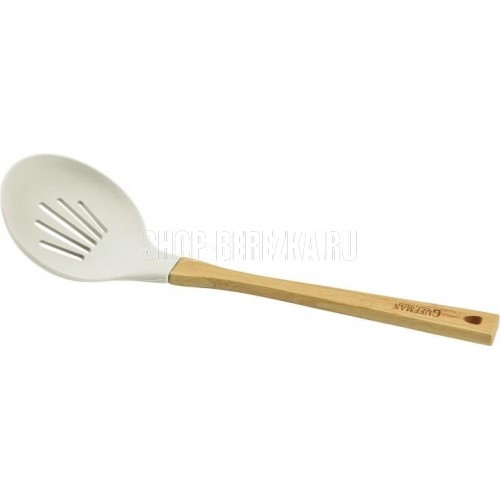 Шумовка силиконовая белого цвета с бамбуковой ручкой . Ручка имеет отвертие для подвеса на крючок или рейлинг. Не содержит бисфенол А и фталаты. Выдерживает температурный режим от -20С до +220С