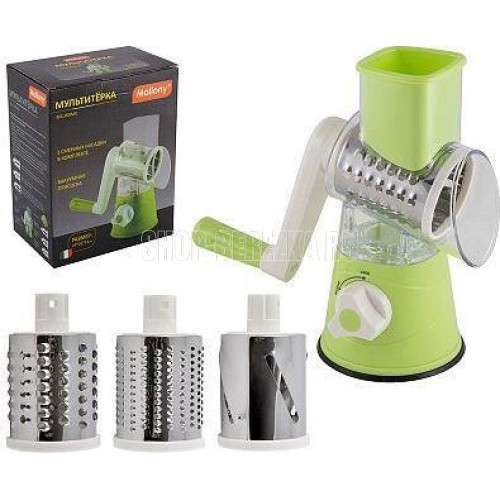 Мультитерка похожа на обычную мясорубку, но таковой не является. При помощи этого незаменимого прибора можно нарезать овощи для салата. Их идеально ровная форма поразит гостей. Вакуумная присоска в основании надежно фиксирует терку на рабочей поверхности. С помощью мультитерки можно: - шинковать капусту для салата, делать тонкие пластины из картофеля или яблок для чипсов - натирать шоколад и орехи, готовить панировку - нарезать овощи ломтиками В комплект входят: - корпус мультитерки - 3 насадки (7*7*11 см) Размер: 24*26*11 см Материал: ABS пластмасса, полистирол, нержавеющая сталь (430)