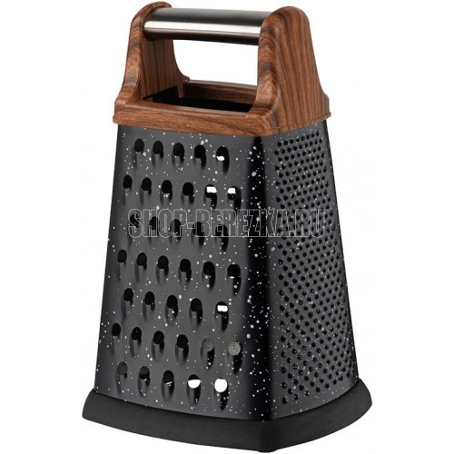 Терка четырехгранная с прорезиненным основанием Пластиковая рукоятка с вставкой из нержавеющей стали (430), окраска под темное дерево. Окраска стали: черный мрамор. Размер: 13*11*20 см. Толщина стали: 0,23 мм. Материал: нержавеющая сталь (430), АБС пластмасса, ТПР.