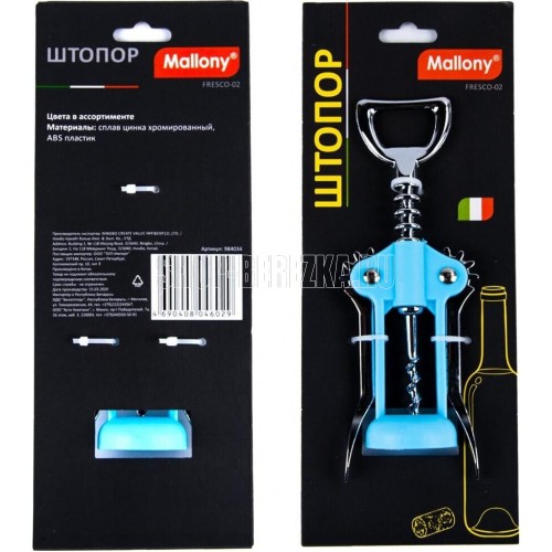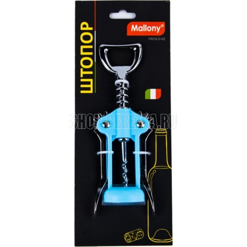 Штопор серии FRESCO Материалы: сплав цинка, хромированный, ABS пластик Размеры: 17*5*3,7 см Вес: 75 грамм Цвета в ассортименте: синий/зеленый Упаковка: цветная картонная подложка с подвесом. Не рекомендуется мыть в посудомоечной машине.