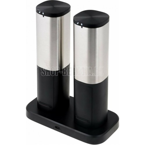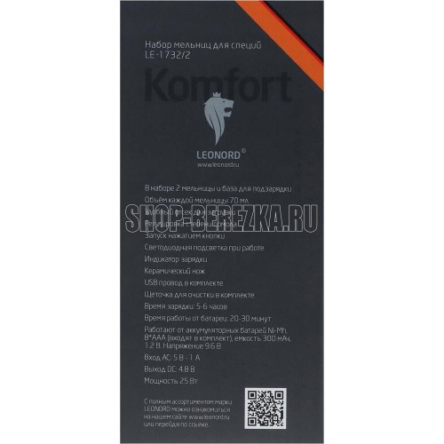 В наборе 2 мельницы и база для подзарядки Объём каждой мельницы 70 мл Удобный отсек для загрузки Регулировка степени помола Запуск нажатием кнопки Светодиодная подсветка при работе Индикатор зарядки Керамический нож USB провод в комплекте Щеточка для очистки в комплекте Время зарядки: 5-6 часов Время работы от батареи: 20-30 минут Работают от аккумуляторных батарей Ni-Mh, 8*ААА (входят в комплект), емкость 300 мАч, 1.2 В. Напряжение 9.2 В Вход AC: 5 В - 1 А Выход DC: 4.8 В Мощность 25 Вт Гарантия 2 года