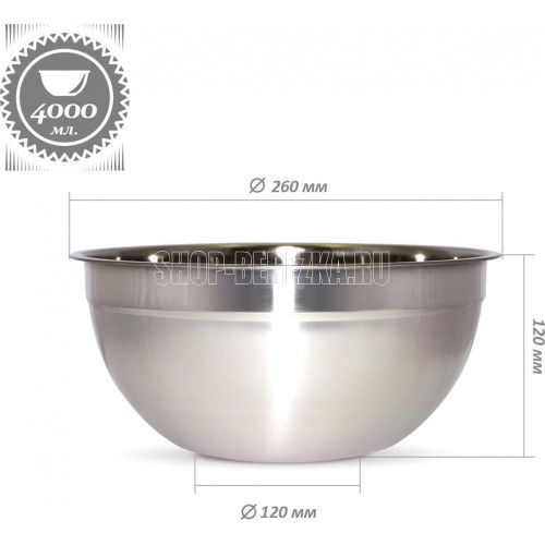 Миска из нержавеющей стали № 201 зеркальная полировка внутри снаружи - комбинированная полировка (матовая/зеркальный ободок) толщина стали: 0,45 мм однослойное дно размер 26*12 см объем - 4 л, тм Mallony Упаковка: стикер, пакет Не рекомендуется мыть в посудомоечной машине.