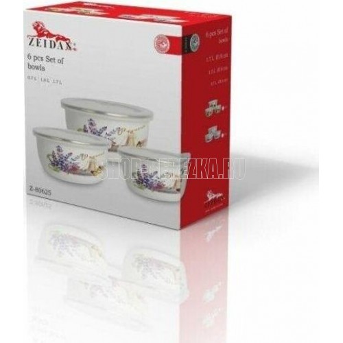 Набор мисок ZEIDAN Z-80625-02, 6 предметов, Набор мисок, 6 предм. (3 МИСКИ С КРЫШКАМИ: 0,7 Л (d14 см), 1,0 Л (d16 см), 1,7 Л (d18 см) с внутренним эмалированным покрытием), эмалированная сталь, внешнее покрытие - эмаль с рисунком. Подарочная упаковка.