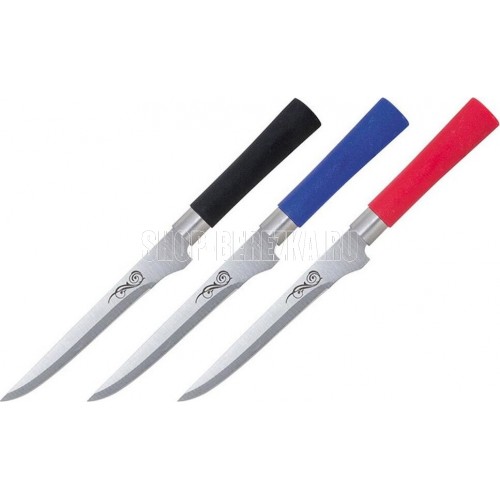 Длина лезвия: 12,5 см Толщина лезвия: 1 мм Литая противоскользящая пластиковая ручка Материал: нержавеющая сталь (3CR13), пластмасса Цвет ручки микс: черный, синий, красный Упаковка: одинарный блистер