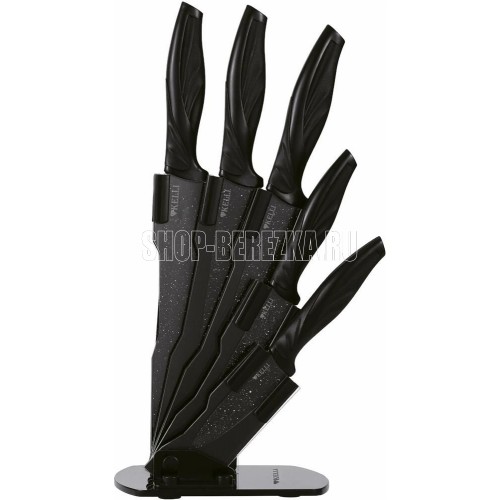Набор кухонных ножей на подставке Высококачественная сталь 6 предметов Нож поварской 20 см Нож хлебный 20 см Нож для резки 20 см Нож универсальный 12,5 см Нож овощной 9 см Острая режущая кромка Практичная подставка Легкая заточка Удобные ручки Восхитительный дизайн