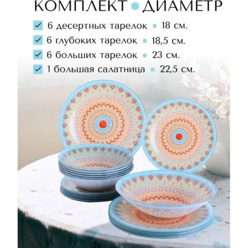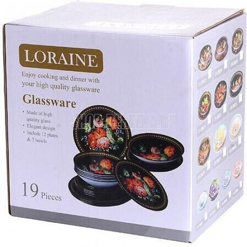Набор посуды LORAINE выполнен из стекла и декорирован красочным орнаментом. Данный набор предназначен для сервировки обеденного стола на 6 персон. Форма изделий круглая. Классический дизайн сочетается в нем с максимальной функциональностью. Такой набор послужит отличным подарком к любому празднику, а также добавит элегантности и уюта любому праздничному столу Посуда обладает гладкой непористой поверхностью, не впитывает запахи, устойчива к перепадам температуры и легко моется. В набор входит 6 десертных тарелок, 6 глубоких тарелок, 6 больших тарелок и 1 большая салатница. Подходит для мытья в посудомоечной машине.