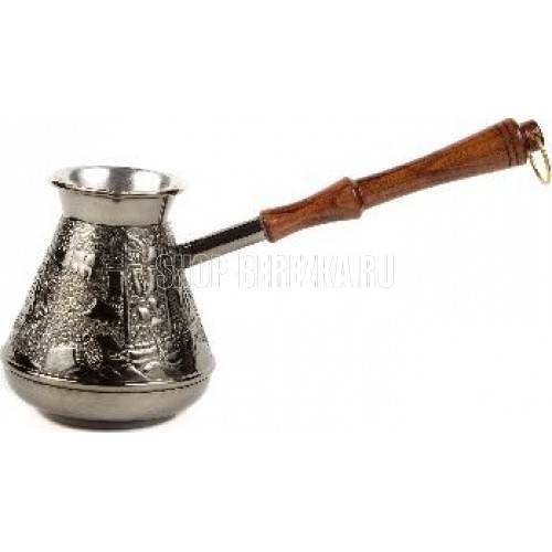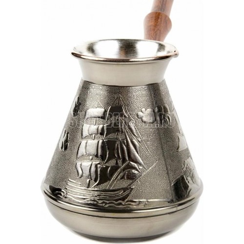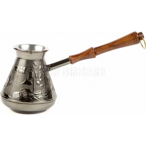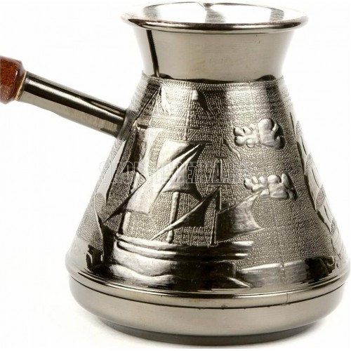 "Алые Паруса" Медная турка классической конусообразной формы с утолщённым дном предназначена для приготовления ароматного натурального кофе. Внутренняя поверхность покрыта пищевым оловом. Наружная сторона украшена оригинальным орнаментом. Деревянная ручка является надёжным теплоизолирующим материалом. Подходит для всех типов плит, кроме индукционных. Проста в эксплуатации. Объём: 500 мл.