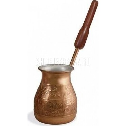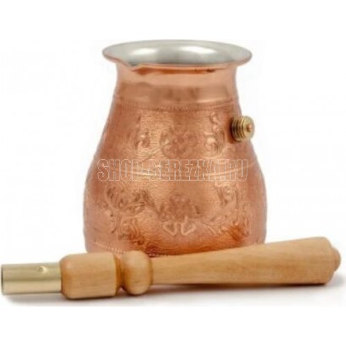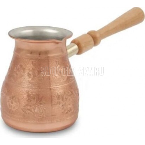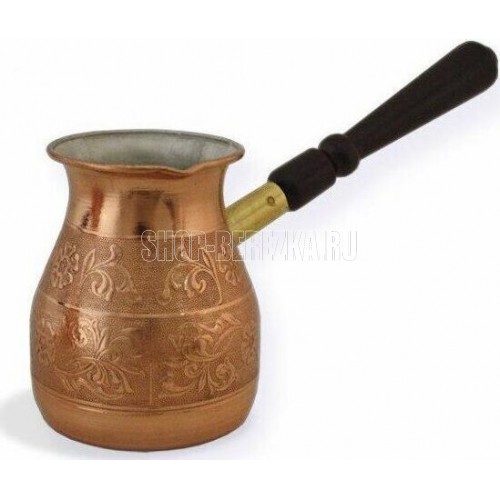 Турка изготовлена из меди, прекрасно подходит для приготовления настоящего кофе на плите. Внешняя поверхность имеет декоративное тиснение, что придает изделию оригинальный внешний вид. Внутренняя сторона покрыта пищевым оловом. Изделие оснащено небольшим носиком и удобной не нагревающейся деревянной ручкой с петелькой для подвешивания. Надежное крепление ручки гарантирует безопасное использование.