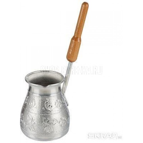 Алюминиевые турки изготавливаются из листового металла- сплав А5М. Состав : алюминий, бук; Объем: 420мл; Упаковка: п/э пакет Красивые, прочные и удобные изделия из алюминия органично впишутся в интерьер вашей кухни. Безопасность для человека обеспечиваем системой управления качеством и сертификацией продукции. При эксплуатации возможно потемнение поверхности вследствие окисления алюминия. Для удаления темного налета с алюминиевой кофеварки наливают воду и добавляют столовый уксус из пропорций 100 гр уксуса на 1 литр воды и подвергают кипячению. После кипячения раствор сливают, поверхность промывают с моющим средством; важно не мыть алюминиевую турочку в посудомоечной машине во избежание потемнения поверхности и появления серого налета;