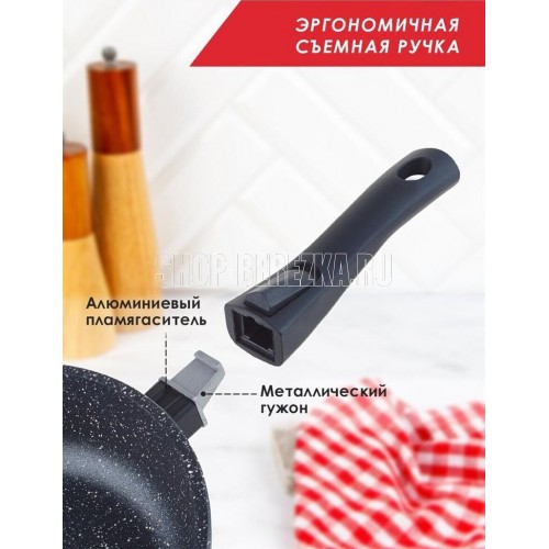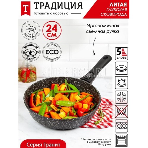 Объем, л./размер, см: 24 см Материал: литой алюминий Коллекция/серия: Гранит Торговая марка: Традиция Толщина дна: 6 Толщина стенок: 4 Источник тепла: Все виды плит, кроме индукционной Тип упаковки: цветной рукав Внутреннее покрытие: антипригарное покрытие Pfluon Внешнее покрытие: антипригарное покрытие Pfluon Ручка: съемная soft-touch