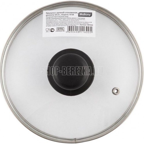 Стеклянные крышки с металлическим ободком и паровыпуском изготавливаются согласно ГОСТ Р51969-2002. При производстве крышек используетсялистовое термостойкое стекло толщиной 4 мм марки М1-М4. Специальная термическая обработка стекла делает его ударопрочным и более устойчивым к изменениям температур, а метод штамповки обеспечивает большую легкость и прозрачность штампованных крышек по сравнению с литыми. Обод и заклепка паровыпуска выполнены из высококачественной нержавеющей стали марки AISI 201. Они предотвращают сколы на стекле при эксплуатации. Ручка изготовлена из термостойкого пластика. Использование стеклянных крышек позволяет контролировать процесс приготовления пищи без потери тепла. Можно мыть в посудомоечной машине.