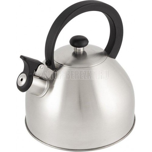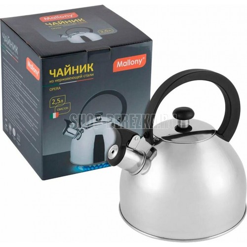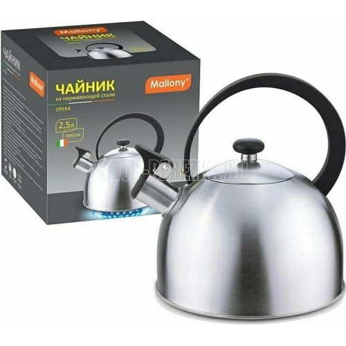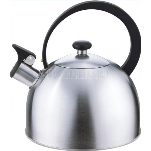 Чайник из нержавеющей стали № 201 со свистком с крышкой, с ручкой из нейлона, матовый внутри/матовый - снаружи, дно - одинарное, подходит для всех типов плит, толщина стали - 0.3-0,35 мм, литраж - 2,5 литра, упаковка - стикер + хенгтег. Модель - "Opera" Материалы - нержавеющая сталь, нейлон. Не рекомендуется мыть в посудомоечной машине.