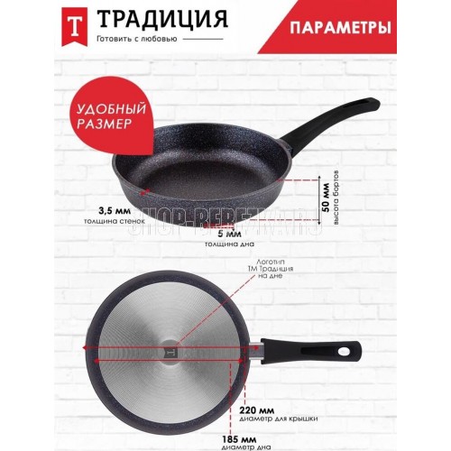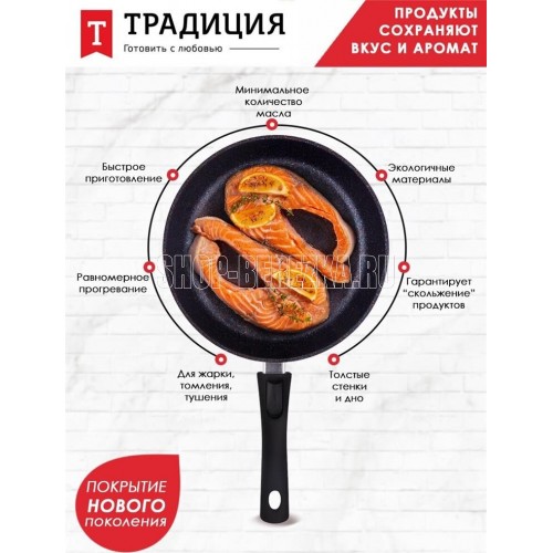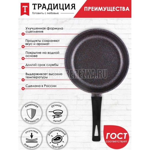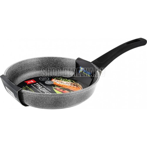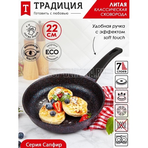 Сковорода а/пр литая 22см Сапфир ТМ Традиция, мраморное покрытие, изготовлена из литого алюминия толщина стенки- 3,5 мм; Толщина дна- 5,0 мм. Подходит для всех типов плит, кроме индукционных. Можно мыть в посудомоечной машине. Произведено в РОССИИ.