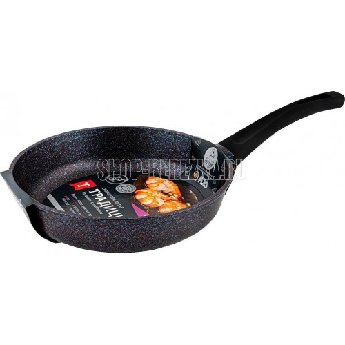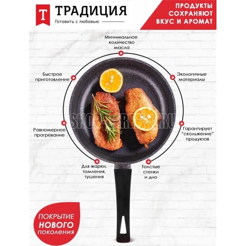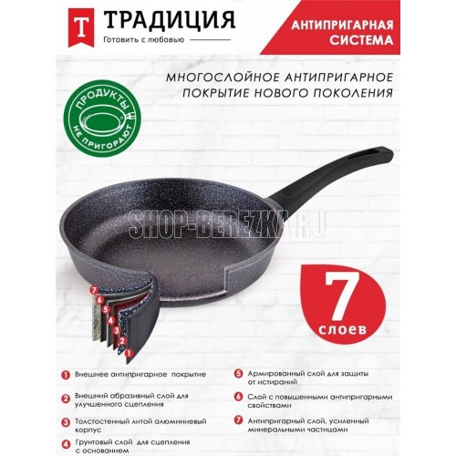 Сковорода а/пр литая 24см Сапфир ТМ Традиция, мраморное покрытие, изготовлена из литого алюминия толщина стенки- 3,5 мм; Толщина дна- 5,0 мм. Подходит для всех типов плит, кроме индукционных. Можно мыть в посудомоечной машине. Произведено в РОССИИ.