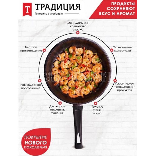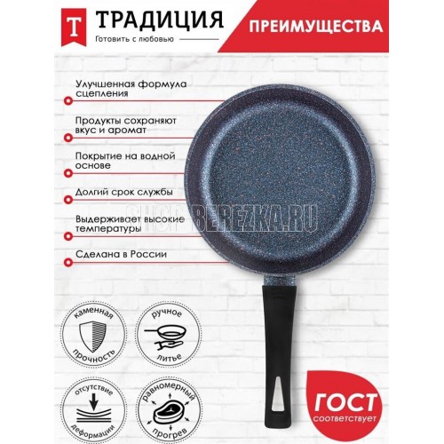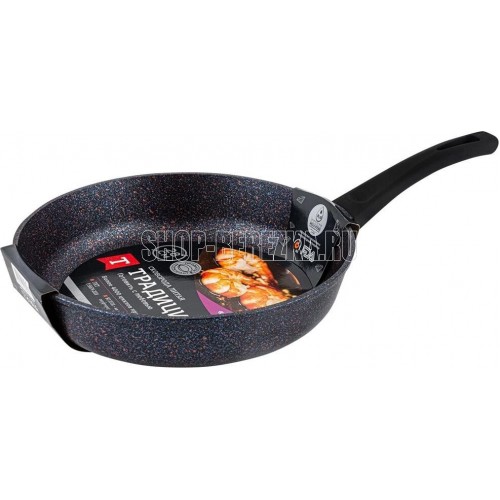 Сковорода а/пр литая 28см Сапфир ТМ Традиция, мраморное покрытие, изготовлена из литого алюминия толщина стенки- 3,5 мм; Толщина дна- 5,0 мм. Подходит для всех типов плит, кроме индукционных. Можно мыть в посудомоечной машине. Произведено в РОССИИ.