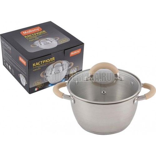 Кастрюля из нерж стали с крышкой, матовая,2,5 л, серия Fortuna, V-shape, ручки с сил-ном, тм Mallony Объем: 2,5 литра. Материалы: нерж сталь 201 (толщина стенок 0,5 мм), силикон, алюминий, 430 сталь, жаропрочное стекло. Размер: 18*11,5 см, капсулированное 3-слойное дно (нерж сталь 201+1,5 мм алюминий+ база 430 сталь), подходит для всех типов плит, матовая внутри и снаружи, крышка из жаропрочного стекла с отверстием для выпуска пара, С-тип, отметки литража, ручки полые из нерж стали 201 с силиконовыми вставками, упаковка — пакет и цветная коробка. Не рекомендуется мыть в посудомоечной машине. Мыть теплой водой с мягким моющим средством.