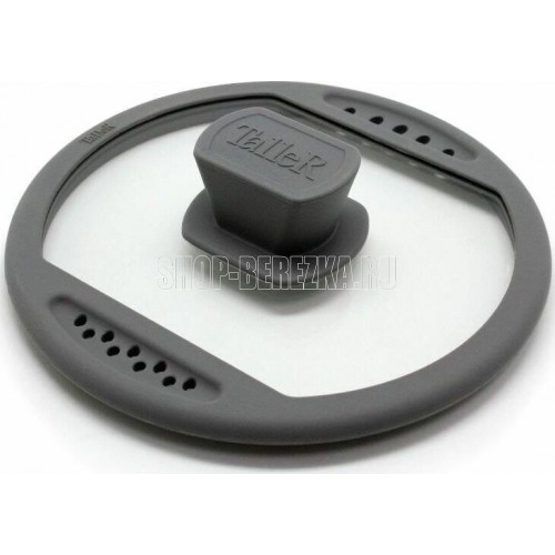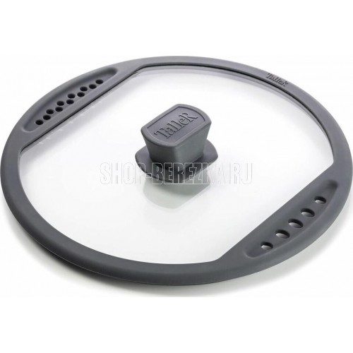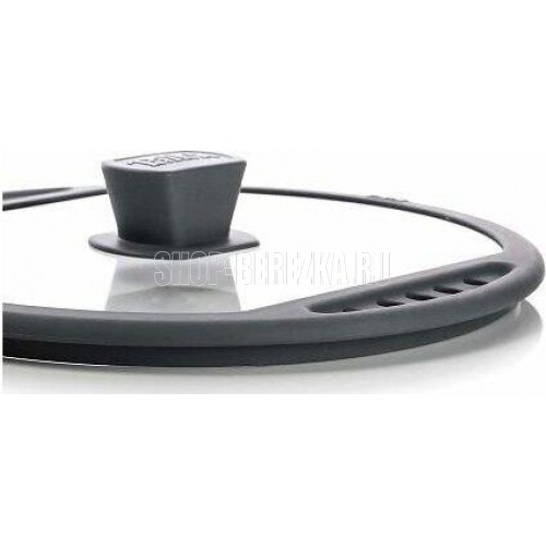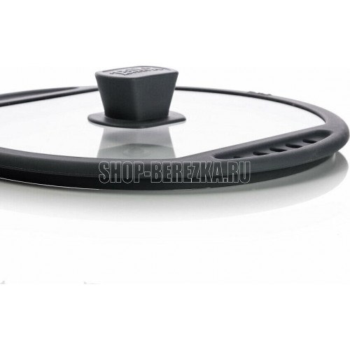 Крышка из жаропрочного стекла, диаметр 28см. Силиконовый обод с отверстиями для слива жидкости, силиконовая ручка. Нельзя использовать в духовке.