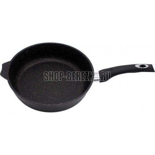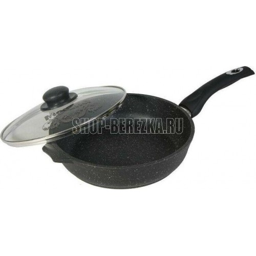 Сковорода 22см с антипригарным покрытием, несъемной ручкой и стеклянной крышкой серии "Гранит black". Подходит для всех типов плит, кроме индукционных. Можно использовать в посудомоечной машине.