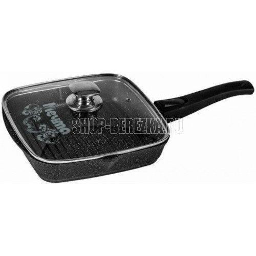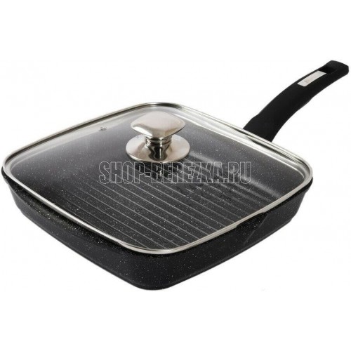 Сковорода-гриль квадр. 24*24 см с антипригарным покрытием, несъемной ручкой и стеклянной крышкой серии "Гранит black". Подходит для всех типов плит, кроме индукционных. Можно использовать в посудомоечной машине.