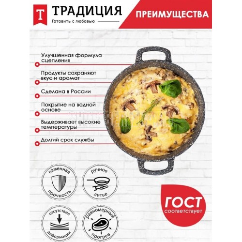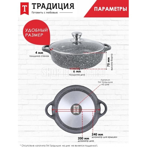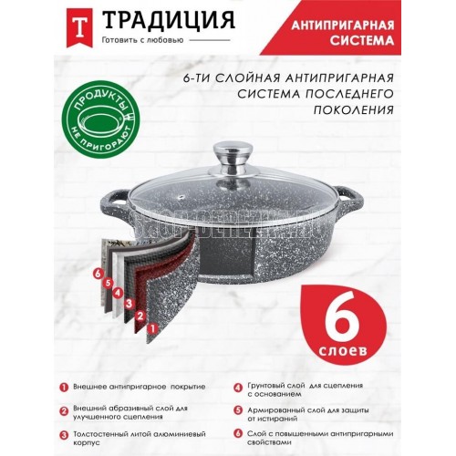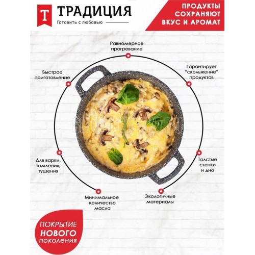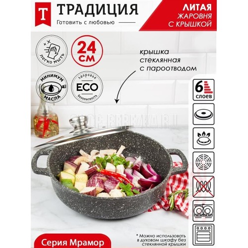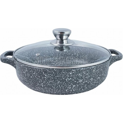 Серия- Мрамор Материал — литой алюминий, материал крышки - стеклок Объем- 2,2 л. Диаметр - 24 см. Покрытие - антипригарное покрытие Greblon NewTec C2+ Толщина дна - 6мм, толщина стенок - 4 мм