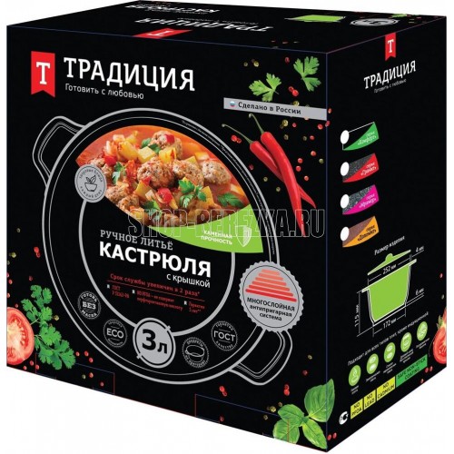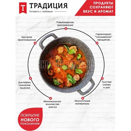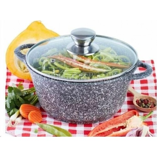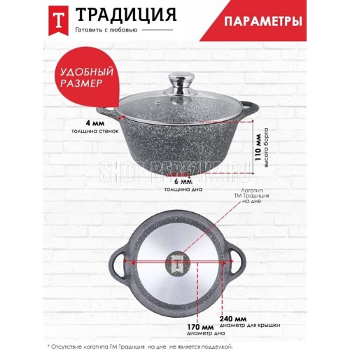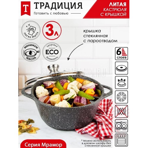 Объем, л./размер, см: 3.0л. 24см Материал: литой алюминий Коллекция/серия: Мрамор Торговая марка: Традиция Толщина дна: 6 Толщина стенок: 4 Источник тепла: Все виды плит, кроме индукционной Тип упаковки: цветная коробка Крышка: стеклянная Внутреннее покрытие: антипригарное покрытие Pfluon Внешнее покрытие: антипригарное покрытие Pfluon