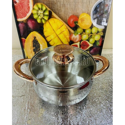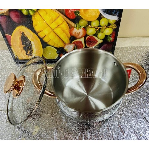 Кастрюля ZEIDAN Z-501069 2,7 л с крышкой, Кастрюля со стеклянной крышкой - 2,7 Л (O18 см), нержавеющая сталь, 3-x СЛОЙНОЕ КАПСУЛИРОВАННОЕ ИНДУКЦИОННОЕ ДНО, крышка - стекло, ручки на корпусе и крышке "ПОД ЗОЛОТО", комбинированная полировка снаружи, матовая полировка внутри. Подарочная упаковка.