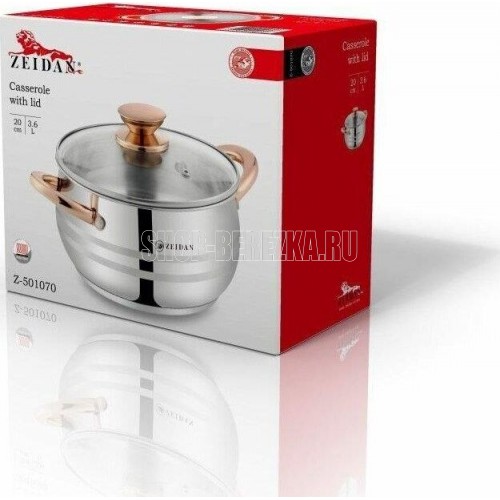 Кастрюля ZEIDAN Z-501070 3,6 л с крышкой, Кастрюля со стеклянной крышкой - 3,6 Л (O20 см), нержавеющая сталь, 3-x СЛОЙНОЕ КАПСУЛИРОВАННОЕ ИНДУКЦИОННОЕ ДНО, крышка - стекло, ручки на корпусе и крышке "ПОД ЗОЛОТО", комбинированная полировка снаружи, матовая полировка внутри. Подарочная упаковка.