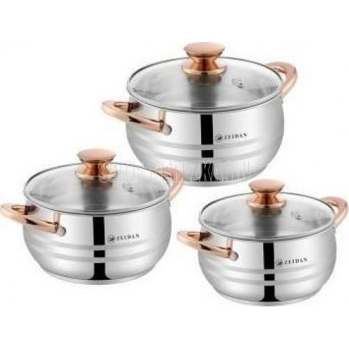 Набор посуды ZEIDAN Z-50657 6 предметов, Набор кастрюль, 6 предм. (3 КАСТРЮЛИ С КРЫШКАМИ: 2.0 Л (d16 см ), 2,7 Л (d18 см ), 3,6 Л (d20 см ), нержавеющая сталь, 3-x СЛОЙНОЕ КАПСУЛИРОВАННОЕ ИНДУКЦИОННОЕ ДНО, крышки - стекло, ручки на корпусе и крышке "ПОД ЗОЛОТО", комбинированная полировка снаружи, матовая полировка внутри. Подарочная упаковка.