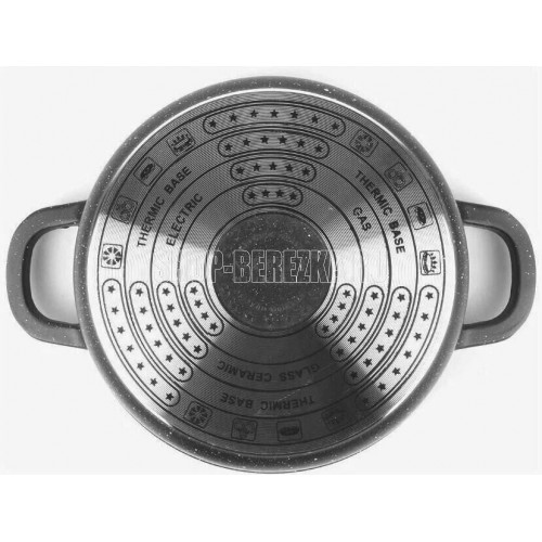 Кастрюля с мраморным антипригарным покрытием. Объем: 1,5 л. Диаметр: 16 см. Индукционное дно. Материал: алюминий. Жаропрочная стеклянная крышка с паровыпуском. В комплекте силиконовые насадки на ручки. Пригодна для всех видов плит.