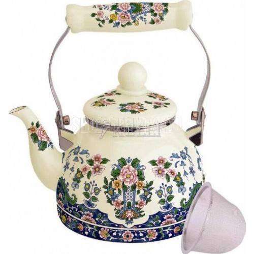 Эмалированный чайник с ситом Объем: 1,5 л. 3-х слойное внутреннее и внешнее эмалированное покрытие Удобная керамическая ручка не нагревается Сито для заварки Подходит для всех видов плит Пригоден для посудомоечной машины Стильный дизайн