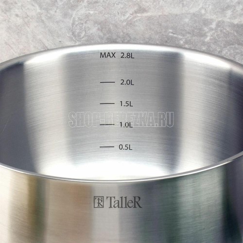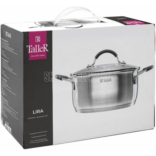 Кастрюля с крышкой Lira 2,8 л. Диаметр 20 см, высота 10 см Внешний диаметр дна - 18 см Материал - нержавеющая сталь. Толщина стенок 0.5 мм Толщина дна 4,0 мм Подходит для всех типов плит, в т.ч. индукционной. Упаковка - цветная коробка.