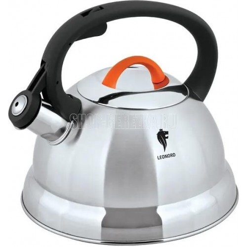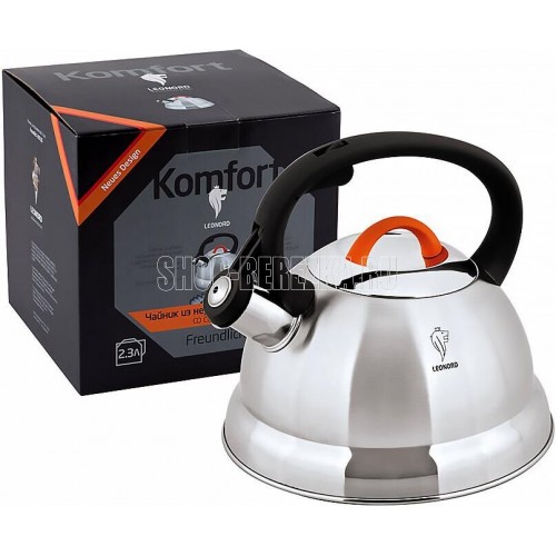 Чайник из нержавеющей стали со свистком Freundlich Материалы - нерж сталь, бакелит, силикон, алюминий. Материал корпуса: высококачественная нержавеющая сталь, толщина 0,3 мм; Объем: 2,3 литра; Капсулированное дно обеспечивает быстрое нагревание и равномерное распределение тепла; Чайник снабжен свистком и устройством открывания носика на ручке; Комбинированная полировка корпуса: матовая, зеркальная. Цвет корпуса: стальной, матовый, с декоративной полированной частью; Прочная комбинированная бакелитовая ручка с покрытием soft touch; Ручка на крышке с силиконовым покрытием; Несъемный свисток; Подходит для всех типов плит; не рекомендуется мыть в посудомоечной машине. Упаковка: цветная картонная коробка/трансп коробка - 6 штук