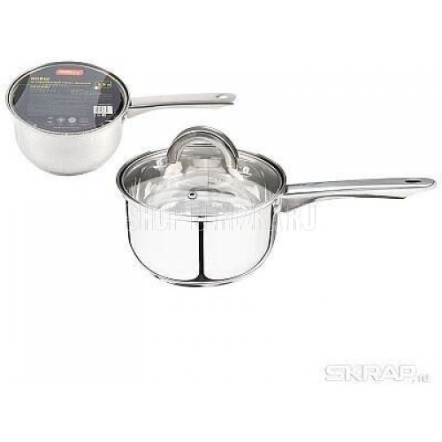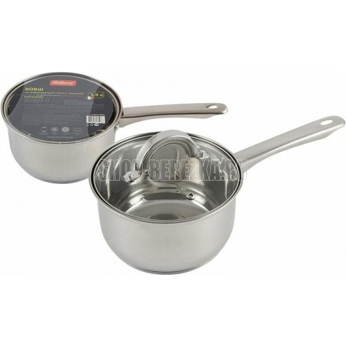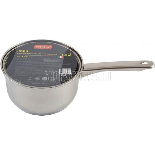 Ковш из нерж стали с крышкой, объем1,9 л, размер: 16*9,5 см, серия "Mediano", тм Mallony Размер: 16*9,5 см, объем — 1,9 л, 201 нержавеющая сталь, толщина — 0,4 мм, дно 3-слойное капсулированное — 0,2 мм нерж сталь 201 +1мм алюминия + 430 сталь 0,5 мм (толщина дна — 1,7 мм), подходит для индукции, снаружи и внутри — зеркальная полировка, полые ручки из нерж стали, С-тип крышка из жаропрочного стекла с отверстием для выпуска пара. Отметки литража.