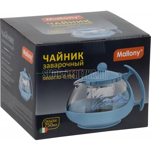Чайник заварочный Корпус из жаропрочного стекла/крышка/ ручка из пластика Фильтр из нержавеющей стали, усиленный. Объем — 750 мл Толщина стекла — 1,2 мм 4~11.5?10-6 — коэффициент линейного расширения Упаковка — пузырчатая пленка/цветная коробка