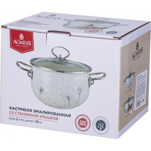 Agness 943-056 DANDELION КАСТРЮЛЯ AGNESS ЭМАЛИРОВАННАЯ СО СТЕКЛЯННОЙ КРЫШКОЙ, 2 Л ДИА 18СМ; Не использовать абразивные чистящие средства;; • Мыть с применением нейтральных моющих средств, подходит для мытья в посудомоечной машине;; • Избегать резкого перепада температур.; • Не нагревать пустую посуду, а также не допускать выкипания воды. Эмалированные кастрюли не подходят для жарки блюд.; • При транспортировке, хранение и спользовании необходимо оберегать эмалированную посуду от механических повреждений; • проверять надежность крепления ручек перед каждым использованием