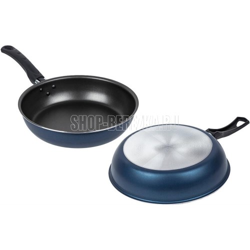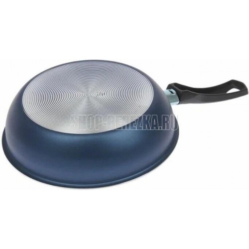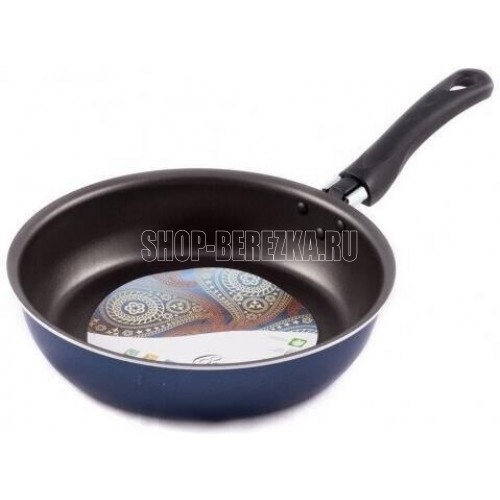 Сковорода Сатин диаметром 22 см простая, легкая и надежная посуда на каждый день по доступной цене. Европейское антипригарное покрытие внутри надежно защищает еду от пригорания, внешний слой декоративного покрытия также имеет антипригарные свойства, легко моется и долго сохраняет аккуратный вид и насыщенный синий цвет. Прочный корпус из штампованного алюминия с эргономичной бакелитовой ручкой делает использование сковороды удобным и безопасным.