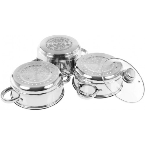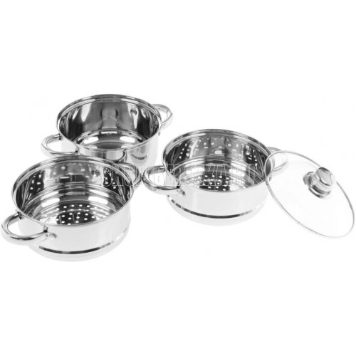 Пароварка -мантоварка; Объем: 4,1л; Диаметр: 22см; 3х-слойное капсульное дно; 2 кастрюли-дуршлаг; Прозрачная стеклянная крышка с паровыпуском; Удобные термостойкие клепаные ручки; Высококачественная нержавеющая сталь; Зеркальная полировка; Подходит для всех видов плит