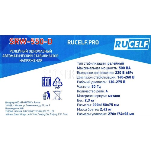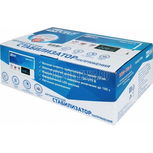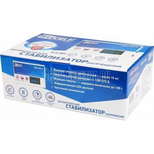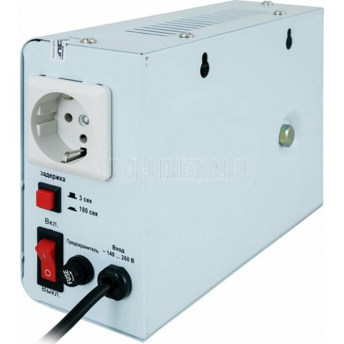 Тип стабилизации: Релейный. Мощность: 500 ВА. Диапазон стабилизации: 140-260 В. Рабочий диапазон: 130-275 В. Точность стабилизации: ±8%. Количество реле: 4. Частота: 50 Гц. Материал корпуса: металл. Кнопка выбора задержки выходного напряжения: есть (3 или 180 с). Габаритные размеры: 220х150х75 мм. Вес: 2,3 кг.